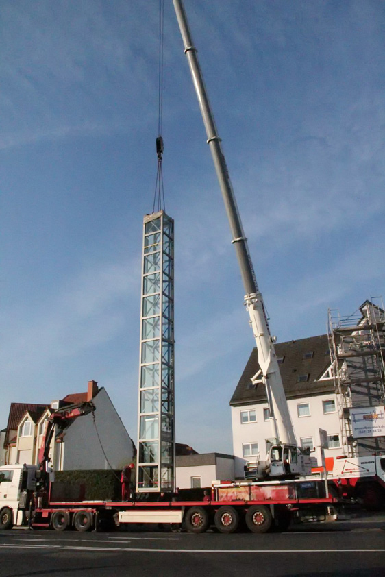 Der Plattformlift ohne Kabine, der mit einem verglasten Leichtmetall-Schachtgerüst eine Einheit bildet, wird im Ganzen geliefert und kann an Außen- wie Innenfassaden montiert werden.