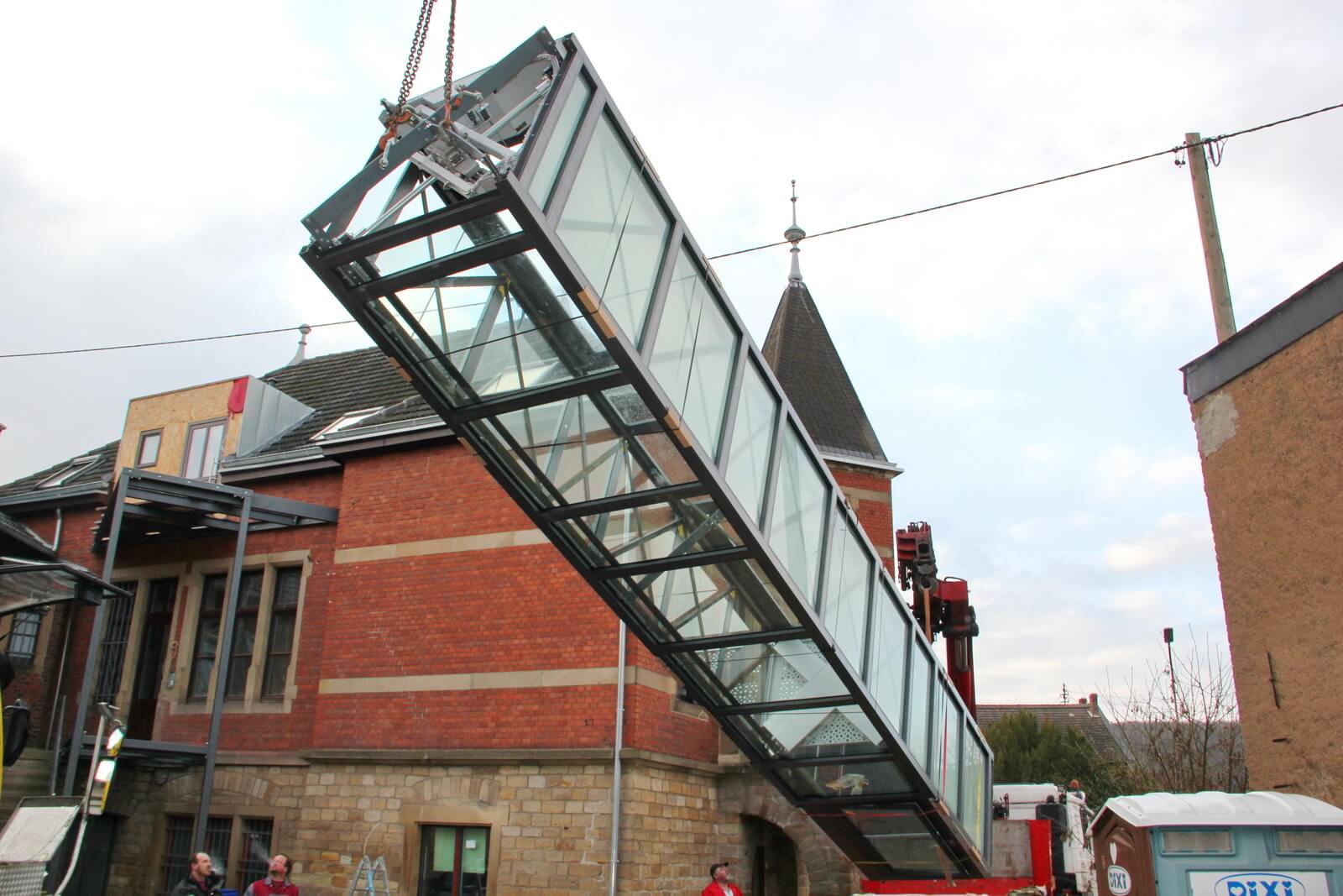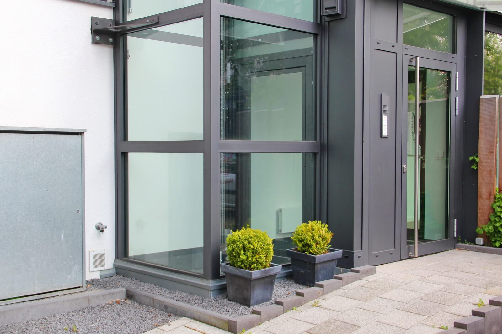 Der Plattformlift ohne Kabine, der mit einem verglasten Leichtmetall-Schachtgerüst eine Einheit bildet, wird im Ganzen geliefert und kann an Außen- wie Innenfassaden montiert werden.